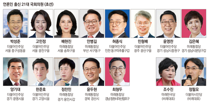 더불어민주당의 압승으로 끝난 21대 국회의원 총선에서 기자 등 언론인 출신 후보 15명이 처음으로 여의도 입성에 성공했다. 더불어민주당(더불어시민당 포함)에서 8명이, 미래통합당(미래한국당 포함)에서 7명의 초선 의원이 나왔고, 언론사별로는 동아일보와 MBC 출신이 각 3명으로 가장 많았다.