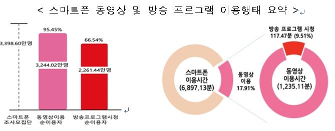 조사에 따르면 국내 스마트폰 보유자 중 1개월 내 1번 이상 동영상을 시청한 이용자(순이용자)는 95.45%였고, 개인별 월평균 이용시간은 1235.11분이었다. 스마트폰 보유자 대부분이 동영상을 이용하고 있고, 그 이용시간이 매월 20시간 이상이라는 의미다. 이는 스마트폰 총 이용시간의 17.91%를 차지한다.