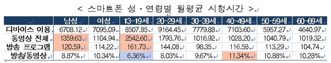 성별·연령대별 스마트폰을 통한 월간 동영상과 방송프로그램 시청시간은 남성과 10대가 긴 것으로 나타났다. 스마트폰 이용시간은 여성(7095.09분)이 남성(6708.12분)보다 많았지만 동영상과 방송프로그램 이용시간은 남성(동영상 전체 1359.63분, 방송프로그램 120.59분)이 여성(1104.94분, 114.22분)보다 각각 250여분, 6분 가량 길었다.