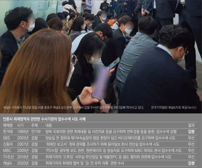 사실 언론사 압수수색이 이번만 문제가 된 것은 아니다. 언론사의 취재행위와 관련한 최초의 압수수색 사건은 31년 전으로 거슬러 올라간다. 1989년 당시 안전기획부는 서경원 평화민주당 의원의 방북 사실을 알고도 수사기관에 알리지 않았다는 이유로 한겨레 편집국을 압수수색하고 취재수첩과 사진 자료 등을 압수했다. 저항하던 기자들은 경찰에 연행됐다. 이후로도 언론사 압수수색 시도는 몇 번이나 있었으나 대부분 성공하지 못했다. 2003년 양승길 전 청와대 제1부속실장의 향응 현장을 몰래 촬영한 영상을 보도한 SBS에 대해 검찰이 비디오테이프 확보를 위해 압수수색영장 집행을 시도했다가 기자들의 저지로 물러났다. 2007년에는 월간 신동아가 입수해 보도한 ‘최태민 보고서’와 관련해 검찰이 압수수색을 시도하다가 포기했고, 2009년 MBC ‘PD수첩’ 광우병 보도 제작진의 이메일과 자택 압수수색에 이어 MBC 본사 압수수색을 시도했으나 저지당했다. 2018년에는 수습 기자의 ‘드루킹’ 사무실 절도 혐의와 관련해 경찰이 TV조선 압수수색을 시도했으나, 역시 기자들의 저지에 막혀 발길을 돌렸다.