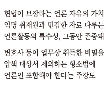 일부 언론법학자들 사이에서는 언론 자유 영역에 대한 법률적 보호를 위해 현재 의사, 변호사, 회계사 등이 업무상 취득한 비밀의 경우 압수수색 대상에서 제외하고 있는 형사소송법 제112조에 언론인을 포함해야 한다는 주장도 나온다. 양재규 변호사는 “기자가 전문직으로서 높은 윤리성, 도덕성을 요구받고 자율성을 인정받으면서 취재원 보호를 하기 위해서는 제도적 장치가 뒷받침되어야 한다”고 말했다.
