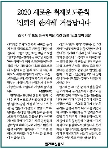 한겨레는 14일 "독자의 신뢰를 높이기 위해 2007년 제정한 '한겨레미디어 취재보도준칙'을 전면 개정했다"며 "법조 보도의 지침이 되는 '범죄 수사 및 재판 취재보도 시행 세칙'도 수정·보완했다. 15일부터 시행에 들어간다"고 알렸다.