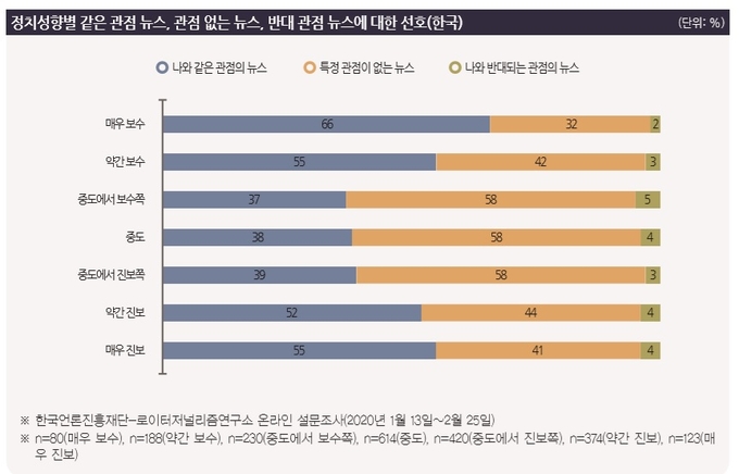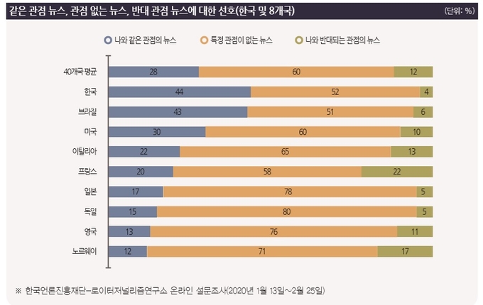 영국 옥스퍼드대 부설 로이터저널리즘연구소의 한국 파트너인 한국언론진흥재단은 지난 17일 ‘편향적 뉴스 이용과 언론 신뢰 하락(6권3호, 이소은·박아란 언론재단 선임연구위원)’을 통해 ‘디지털 뉴스 리포트 2020’ 주요내용을 공개했다. 조사에서 한국은 ‘나와 같은 관점의 뉴스’를 선호한다는 뉴스 이용자 비중이 44%(전체평균 28%)에 달하는 국가였다. 총 40개국 중 네 번째, 터키(55%), 멕시코(48%), 필리핀(46%) 다음이었다. ‘나와 반대되는 관점의 뉴스를 선호한다’는 한국 응답은 4%에 불과해 체코(3%), 헝가리(3%), 대만(3%), 폴란드(3%)에 이어 낮은 수준이었다. ‘특정 관점이 없는’ 뉴스를 선호한다는 비중이 압도적으로 높은 독일(80%), 일본(78%), 영국(76%), 노르웨이(71%) 등 국가와 대비됐다.
