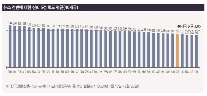 언론재단은 정치성향이 뚜렷하고 정치 관심도가 높은 이들에게서 이 같은 뉴스 선호 성향이 도드라졌다고 지적하며 원 보고서를 인용, “뉴스 전반에 대한 신뢰 하락이 이용자의 뉴스 이용 편향성 때문일 수 있다”고 전했다. “저널리즘 자체의 품질보다는 사람들이 언론 기관에 불만족하거나 언론이 전달하는 뉴스의 관점에 동의하지 못하는 경우가 뉴스 전반에 대한 신뢰 하락에 영향을 주었을 것”이란 의미다. 실제 이번 설문에서도 한국은 ‘뉴스 전반에 대해 신뢰한다’는 응답이 전체 21%로 40개국 중 가장 적은 국가였다. 신뢰와 불신, 중립 등 응답을 모두 포함한 5점 척도 평균으론 36위, 프랑스, 미국, 칠레의 앞 순위였다.