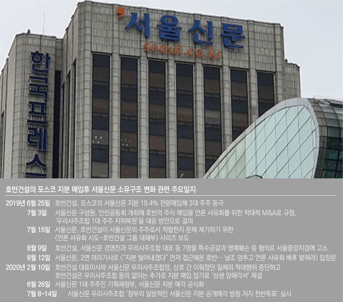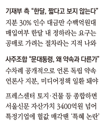 한달 기한을 주며 지분을 처분하겠다는 기재부의 행보를 보면 특정 기업에 서울신문을 넘기려는 의도라는 의심을 거두기 힘들어 보인다. 지난해 6월 호반건설이 포스코가 보유했던 서울신문 지분 19.4%를 전량 매입해 3대 주주가 됐다는 소식에 서울신문 내부는 충격에 휩싸인 바 있다. 당시에도 내부에선 ‘호반이 기재부가 가진 서울신문 지분까지 가져가는 것 아니냐’는 위기감이 고조됐다. 서울신문 구성원은 지난해 7월 만민공동회를 개최해 호반의 주식 매입을 언론 사유화를 위한 적대적 M&A로 규정짓고 ‘우리사주조합 1대 주주 지위복원’ 등을 대응 방안으로 결의한 바 있다. 지난 2월에는 우리사주조합의 동의 없이는 호반건설은 추가로 지분을 매입하지 않는다는 내용 등이 담긴 ‘호반건설과 서울신문의 발전 및 주주 간 상생을 위한 양해각서’가 체결되기도 했다.