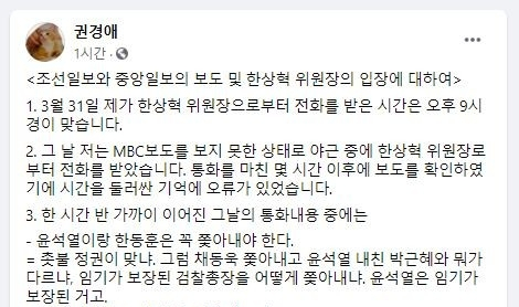발단이 된 건 권 변호사가 지난 5일 새벽 페이스북에 올린 글이었다. 권 변호사는 이 글에서 “MBC의 한동훈과 채널A 기자의 녹취록 보도 몇 시간 전에, 한동훈은 반드시 내쫓을 거고 그에 대한 보도가 곧 나갈 거니 제발 페북을 그만두라는 호소? 전화를 받았다”고 주장했다. 통화 대상에 대해선 “매주 대통령 주재 회의에 참석하시는, 방송을 관장하는 분”이라고 했다. 그러면서 “퍼가지 말라. 소송 걸 것”이라고 경고했다.