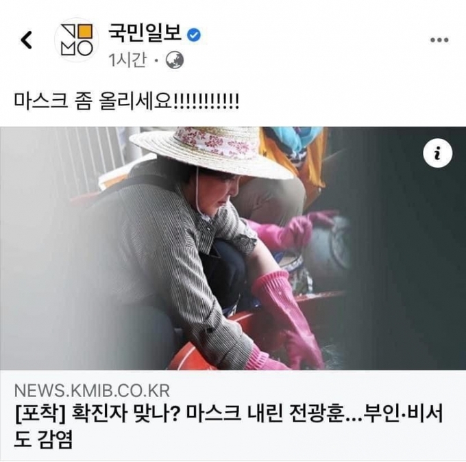 지난 18일 국민일보 페이스북에 올라온 “마스크 좀 올리세요!!!” 내용의 게시물에는 김정숙 여사 사진이 대표사진(썸네일)으로 나왔다. 해당 게시물은 지난 17일 보도된 <[포착] 확진자 맞나? 마스크 내린 전광훈...부인·비서도 감염> 기사를 소개하는 내용이었지만, 정작 페이스북에 올라온 기사 썸네일에는 김정숙 여사 사진이 게시된 것이다. 문제가 된 썸네일은 2시간30분만에 해당 기사에 있던 전광훈 목사 사진으로 수정됐다.
