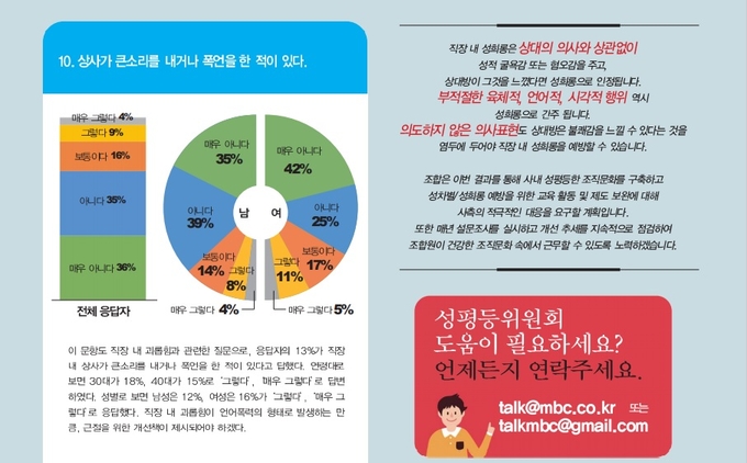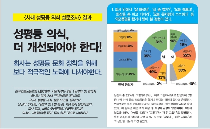 MBC본부는 8월1일부터 31일까지 회사와 함께 사내 구성원들을 대상으로 이 같은 설문을 진행해 남성 573명, 여성 211명 등 총 784명이 응답한 결과를 지난 2일 ‘문화방송 노보 257호'를 통해 공개했다. 총 10개 문항의 설문에 대한 응답결과 전반은 성평등 의식이 어느 정도까지는 구축됐다고 판단할 수 있는 수준이지만 여성과 남성 간 답변 차이가 컸던 일부 문항 등을 통해 개선의 필요성 역시 드러난 탓이다