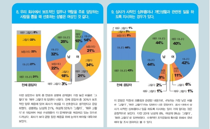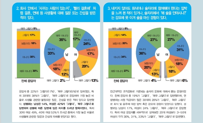 “회사 안에서 ‘사귀는 사람이 있는지’, ‘빨리 결혼해’처럼 결혼, 연애 등 사생활에 대해 질문 또는 간섭을 받은 적이 있다”는 문항 응답결과 역시 남녀 답변 차가 큰 경우였다. 남성은 14%가 '그렇다' '매우 그렇다'고 답한 반면 여성의 경우 이 비율이 42%까지 치솟았다. 특히 30대 여성 49%, 40대 여성 53%가 조사군 중 가장 높은 비율로 사생활 관련 질문과 간섭 경험이 있다고 답변했다. 전체적으론 응답자 22%가 ‘그렇다(17%)’ ‘매우 그렇다(5%)’고 답했다. 연령별로는 30대 38%가 ‘그렇다’, ‘매우 그렇다’고 응답해 가장 높은 비율로 사생활 관련 질문이나 간섭을 받은 적이 있다고 했다.