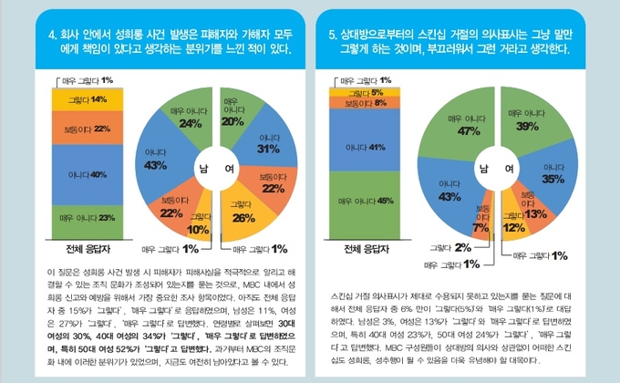 “회사 안에서 성희롱 사건 발생은 피해자와 가해자 모두에게 책임이 있다고 생각하는 분위기를 느낀 적이 있다”는 문항도 성별에 따른 답변 차이가 컸다. MBC본부는 “이 질문은 성희롱 발생 시 피해자가 피해사실을 적극적으로 알리고 해결할 수 있는 조직문화가 조성되어 있는지를 묻는 것으로, MBC 내에서 성희롱 신고와 예방을 위해서 가장 중요한 조사항목이었다”고 설명했다.