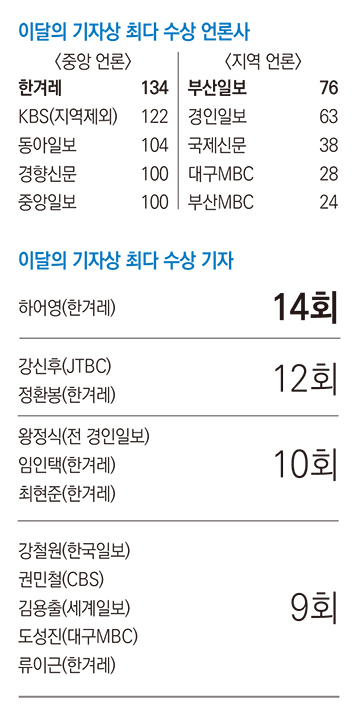 수상작을 가장 많이 낸 언론사는 한겨레(134건)였다. 이어 KBS(122건), 동아일보(104건), 경향신문·중앙일보(100건), SBS(96건) 순으로 많았다. 지역 언론에선 부산일보가 76건으로 가장 많은 수상작을 냈다. 경인일보(63건), 국제신문(38건), 대구MBC(28건) 등이 뒤를 이었다.