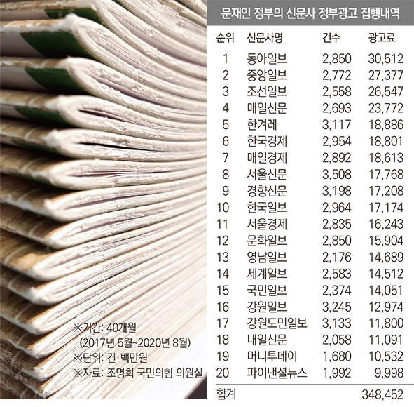 국민의힘 조명희 의원실이 한국언론진흥재단으로부터 제출받은 ‘정권별 매체별 정부광고 집행내역’을 입수해 기자협회보가 분석한 결과 문재인 정부 임기인 지난 2017년 5월부터 올해 8월까지 정부광고액 상위 20위 신문사에 집행된 금액은 총 3484억5200만원이었다. 임기 40개월 간 월 평균 87억1100만원이 집행됐다. 이는 재임 기간 월 평균 집행액 기준 박근혜 정부(2013년3월~2017년4월, 50개월) 74억9200만원, 이명박 정부(2008년3월~2013년2월, 60개월)와 노무현 정부(2003년3월~2008년2월, 60개월) 각 62억5100만원, 41억3300만원을 넘어 역대 최고 수준이다. 정부별 임기 차이를 고려해 매체별 광고료를 단순 합산하지 않고 재임 개월 수로 나눠 더한 후 비교하는 방식을 택했다.