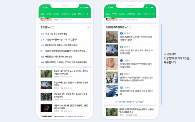 이에 따라 지난 23일부터 네이버 뉴스홈에서 ‘많이 본 뉴스’, ‘댓글 많은 뉴스’가 사라졌다. 그동안 네이버는 정치, 경제, 사회 등 분야별, 연령별로 조회수와 댓글이 많은 뉴스를 30위까지 제공해왔다. 이제 그 자리는 ‘언론사별 가장 많이 본 뉴스<사진>’가 차지했다. 각 언론사에서 조회수가 가장 많은 뉴스를 1시간마다 집계해 보여주는 것이다.