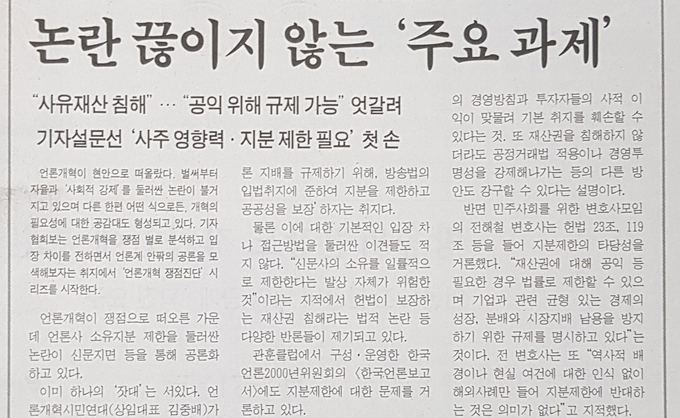 기사에 등장한 다섯 가지 쟁점은 언론사 사주의 지분 소유 제한 가능성, 신문판매시장 정상화, 경영 투명성 강화, 편집권 독립 등이다. 2020년 현안에 그대로 들어맞진 않지만 그때나 지금이나 언론이 개혁의 대상이라는 점은 변하지 않았다. 당시 기사에서 한 기자는 “언론개혁이라는 말은 멀게 느껴진다”며 “그런 식의 거대담론은 원론적으로 항존할 수밖에 없는 문제다. 기본으로 돌아가 사실보도에 신경 쓰는 게 중요한 것 아닌가”라고 말했다.