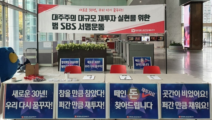 SBS 노조가 대주주의 대규모 재투자 실현을 위한 서명운동을 시작했다. 방송통신위원회가 지난 6월 SBS의 최다액출자자 변경(SBS미디어홀딩스→TY홀딩스)을 승인하며 부과한 조건을 두고 사측과 대립해온 전국언론노조 SBS본부는 지난 9일 “누가 이기고 지는 식의 전략적 접근보다는 대대적인 재투자를 성취하는 게 무엇보다 중요하다고 판단했다”며 서명운동에 돌입한 배경을 설명했다.