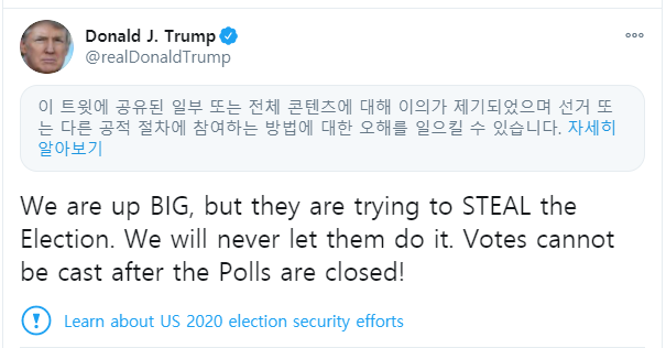 지난 4일 올라온 도널드 트럼프 미국 대통령의 “우리가 대승했지만, 저들(민주당)이 선거를 훔치려고 한다”는 트윗<사진>은 “이 트윗에 대해 이의가 제기됐으며 다른 공적 절차에 참여하는 방법에 대한 오해를 일으킬 수 있다”는 경고 라벨이 붙으며 차단됐다. 트럼프가 같은 날 페이스북에 올린 글에도 “최종 결과와 초기 투표 집계는 모든 투표가 집계되기까지 며칠이 소요되므로 차이가 있다”는 경고 라벨이 함께 게시됐다.