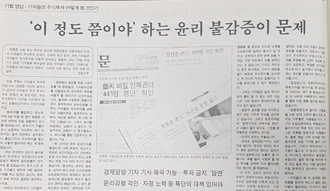 벤처 붐이 일었던 2000년. 덩달아 주식시장 열기도 뜨거웠다. 기자들 사이에서도 주식 투자가 성행하던 그때 ‘정현준 사건’이 터졌다. 벤처기업인 정현준씨가 조성한 700억원대 사설 펀드의 투자자 600여명 중 언론인이 포함돼 있다는 보도가 잇따르면서 주식 투자 문제가 기자사회의 논쟁거리로 떠올랐다.