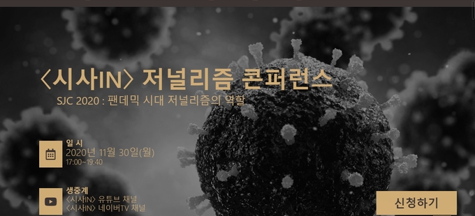 ‘신종 바이러스가 언론을 만났을 때-팬데믹 시대 저널리즘의 역할’을 주제로 하는 이번 콘퍼런스는 오는 30일 개최되며 오후 5시부터 오후 7시40분까지 유튜브‧네이버TV 채널을 통해 생중계된다. 참가비용은 무료이고, 온라인 사전 신청 페이지 주소는 http://sjc.sisain.co.kr 이다.