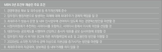 다만 방통위는 MBN에 역대 최다인 17가지의 재승인 조건을 부가했다. 앞서 3년 조건부 재승인을 받은 TV조선에 부가된 11가지 조건보다 더 많다. 17가지 조건 중 7가지는 종편 4사에 공통으로 부가된 것으로 사업계획서 성실 이행, 방송심의규정 위반으로 인한 법정제재 연간 5건 이하 유지, 협찬 사실 고지 등이다. 나머지 조건 10가지 중 대부분은 사실상 최대주주에 책임을 묻는 내용으로, 소유와 경영을 분리하라는 게 핵심이다.