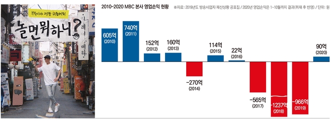 박성제 MBC 사장은 지난 1일 창사 59주년 기념사를 통해 “올해 적자가 1000억원이 넘을 수 있다는 전망이 나왔다. 올 들어 10월까지 영업손익을 따져보니 90억 흑자로 집계됐다. 지난해 같은 기간 대비 730억원 넘게 경영수지가 개선된 것”이라며 “연말에 지출해야 할 비용이 많아 올해 전체로는 흑자가 어려울 수 있다. 그러나 획기적인 성과”라고 밝혔다. MBC에 따르면 올해 1월부터 10월까지 MBC는 협찬수익 484억원을 포함한 광고수익 1739억원, 콘텐츠 유통수익 3093억원 등 총 5433억원의 영업수익을 거뒀다. 영업비용으론 5343억원을 지출해 합산결과 90억원의 영업이익을 기록한 것으로 나타났다. 2017년 -565억원, 2018년 -1237억원, 2019년 -966억원 등 최근 3년 연속 영업손실을 기록해온 터 올해 ‘깜짝 반등’을 이룬 것이다.