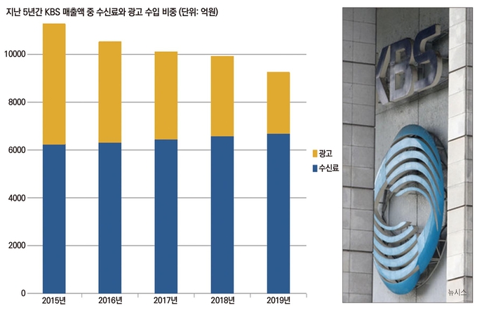 광고 수입 급감이 직격탄이었다. 지난해 지상파 전체 광고시장 규모가 2015년 대비 절반 수준으로 줄었는데, KBS 광고 수입 역시 5000억원대에서 2500억원대로 반 토막 났다. 반대로 수신료 수입은 소폭 상승했다. 2013년 KBS 이사회가 수신료 인상안을 의결할 당시만 해도 수신료보다 광고 비중이 높다는 게 수신료 인상의 걸림돌로 여겨졌는데, 정확히 그해를 기점으로 수신료와 광고 비중이 역전됐다. 2010년 KBS 전체 매출에서 41.2%를 차지했던 수신료 비중은 2019년 49.2%까지 상승한 반면, 광고 비중은 42.7%에서 18.7%까지 추락했다. 광고 수입이 계속 줄어들면 두 수입원의 점유율 차이는 더 벌어질 수밖에 없다. KBS는 줄어든 광고 수입을 수신료 인상으로 보전해 재원 구조의 공영성과 안정성을 강화해야 한다고 주장한다.