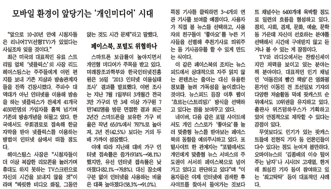 넷플릭스 CEO 리드 헤이스팅스는 7년 전 주주들에게 보낸 편지에 이 같이 썼다. “시청자들이 더 이상 복잡한 리모콘을 눌러가며 휴대도 하지 못하는 TV스크린으로 자신의 시간을 보내지 않을 것”이고 “짜릿한 비디오 화질, 그동안 상상하지 못한 사용자 인터페이스를 경험하게 될 것”이란 전망이었다. 기자협회보는 2013년 12월 기사 <“기성 플랫폼 수명 얼마 안 남았다”>에서 이를 인용, “본방송의 개념이 무력화”되고 “콘텐츠만 잘 만들면 성공할 수 있다는 시대에서 플랫폼을 가진 업체가 강자라는 쪽으로 점차 수렴되고 있다”고 전했다.