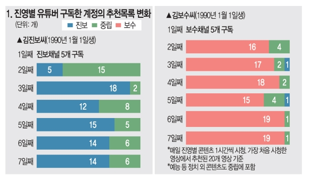 국민일보는 보도에서 “실험 1주일째 둘의 종착지는 친여와 반여로 갈린 극단의 광장이었다. 이미 충성도 높은 지지자들의 활발한 활동으로 추천 알고리즘 내 연결성이 높고, 유저들에게 미치는 영향력도 크다”며 “첫날 시청이 끝나자 진보씨 메인 화면에 걸린 추천 영상 16개 중 4개(25%)가 진보 채널로 바뀌었다. 구독한 채널이 없었는데도 홈 화면에 뜬 진보 채널 수가 2일째 1개, 4일째 6개, 7일째 8개로 늘었다. 보수씨도 첫날 일정 이후 5개의 보수 성향 콘텐츠가 추천됐고, 1주일 후에는 16개 추천 영상 중 9개가 보수 채널로 바뀌었다”고 했다.