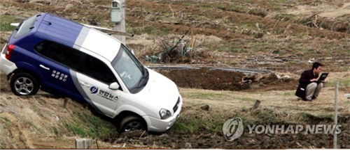 지난 2007년 4월4일 촬영된 경기북부취재본부 김도윤 기자의 모습입니다. 이미 10여년이 훌쩍 지났지만 연합뉴스 기자가 어떤 사람들인지를 제대로 보여주는 사진입니다. 취재 차량이 논에 처박혀 옴짝달싹 못하는 절박한 상황에서도 논두렁에 쪼그려 앉아 노트북을 켜고 취재한 기사와 사진을 전송하느라 여념이 없는 모습.