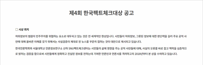 '제4회 한국팩트체크대상'을 2월28일까지 공모한다고 밝혔다.