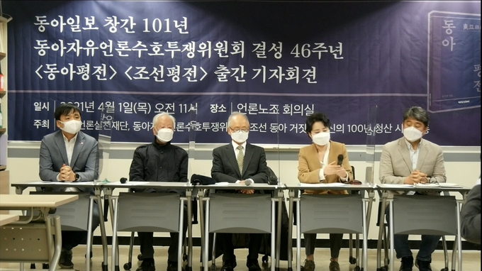 이부영 자유언론실천재단 이사장은 “지난 2019년 자유언론실천선언 45주년을 맞이했을 때 동아조선 100년을 어떻게 맞을 것인가 고민하다가 ‘시대를 거스르는 독극물을 바꿔내지 못한 데 대해 우리들의 게으름, 부족한 노력을 반성하자’며 광화문에서 3보1배를 하고 1인 시위를 했던 게 생각난다. 그 노력들이 모여 오늘까지 왔다”고 회상했다. 그러면서 “101주년을 맞아서도 동아 조선의 오욕에 찬 역사를 극복하려는 노력은 쉼없이 계속되리라 생각한다”며 “언론을 바로 세우기 위한 노력에 범언론단체들이 함께 협력해 나아가길 기원해 마지않는다”고 했다.