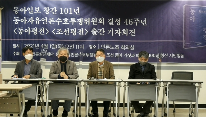 이날 기자회견은 동아일보, 조선일보란 법인에 대한 평전이라 할 <동아평전><조선평전> 책 출간을 기념하는 자리이기도 했다. 해당 저서들은 동아일보와 조선일보에 대한 ‘100년 모니터 보고서’ 성격을 띤다. 저자인 손석춘 건국대 교수는 이날 발언에서 “기자를 ‘기레기’라고 부르는 세태 속에 빠진 게 사주와 언론자본의 문제다. 여전히 중요한 문제인데 이에 대한 경각심은 언론운동에서 많이 빠진 게 아닌가 우려를 갖고 있었다”며 “동아와 조선의 지난 100년을 살펴보면 언론자본, 신문사주 문제가 왜 심각한지를 보여줄 수 있지 않나 생각했다”고 설명했다. 그러면서 “미디어그룹이라 자처하는 ‘신방복합체’ 해체가 다시 한번 논의됐으면 하는 바람이 있다”고 부연했다.