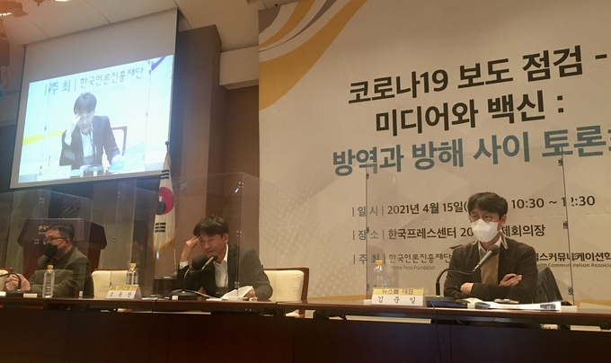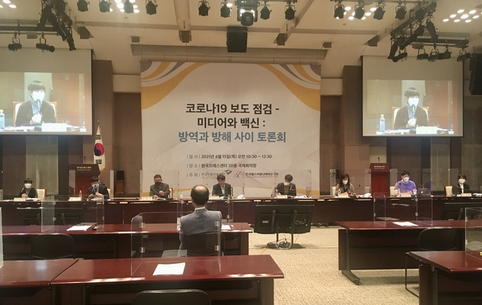 한국언론진흥재단과 한국헬스커뮤니케이션학회 공동 주최로 15일 열린 ‘코로나19 보도 점검’ 토론회. 이날 부제가 ‘미디어와 백신: 방역과 방해 사이’로 정해진 것에서 보듯 언론은 방역 상황에서 종종 ‘방해꾼’ 취급을 받는다. 앞서 언급한 불가리스 보도는 한 예일 뿐이다. 지난해 한국기자협회 등 주도로 제정된 감염병 보도준칙을 지키지 않는 기사는 포털에서 쉽게 찾을 수 있다. 새삼스러운 일도 아니다. 임동준 민주언론시민연합 정책모니터팀장은 “팬데믹에도 변하지 않는 언론”에 원인이 있다고 지적했다.