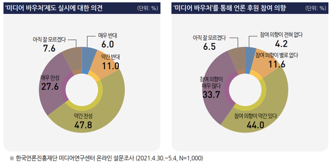 만약 미디어 바우처 제도가 실시된다면 바우처로 언론 후원에 실제 참여할 의향을 물은 질문에도 77.7%가 “참여의향이 있다”고 응답했다. 이 중 “참여 의향이 매우 많다”는 응답은 33.7%, “참여 의향이 없다”는 답변은 15.8%였다. 참여 의향이 있는 가장 큰 이유는 “언론이 지금보다 나아질 것 같아서”(73.7%)인 반면 “언론사 재정에 도움이 될 것 같아서”는 12.7%에 불과했다. 참여 의향이 없는 가장 큰 이유는 “언론 지원에 세금을 사용하는 것이 적절치 않아서”(53.8%)였다. 언론재단은 “바우처를 통한 후원을 언론의 재정적 문제보다는 품질향상 문제로 인식하고 있음을 드러낸다”고 해석했다.