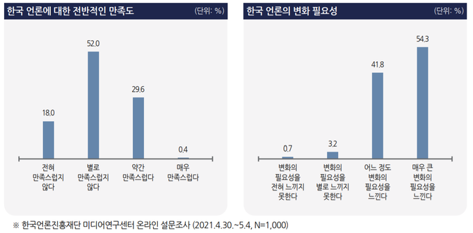 언론재단은 바우처 관련 본격 조사에 앞서 응답자들의 언론에 대한 일반적인 인식도 조사했다. 그 결과 “변화의 필요성을 느낀다”는 응답(‘매우 큰 필요성’ 54.3%, ‘어느 정도 필요성’ 41.8%)은 96.1%에 달했다. 우리나라 언론에 대한 만족도를 묻는 질문엔 ‘불만족’ 응답이 70%였다. 언론에 대한 만족도는 낮은 반면 관여도는 높게 나타났는데 “언론이 마음에 들지 않더라도 국민은 언론에 관심을 기울여야 한다”는 문항에 86.3%가, “국민이 참여하면 언론이 더 나아질 수 있다”엔 86.9%가 긍정적으로 응답했다.