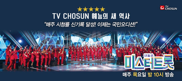 ‘미스터 트롯’은 지난해 1월 첫 방송 당시 12.5%의 시청률(닐슨코리아, 수도권 기준)로 출발해 방송 5회 만에 20%를 돌파하며 유료방송 역대 최고 시청률을 매회 갈아치웠고, 최종회 시청률은 무려 35.7%를 기록했다. 이후 ‘미스터 트롯’ 출연진을 내세운 ‘뽕숭아학당’, ‘사랑의 콜센타’ 같은 프로그램들도 연이어 큰 성공을 거두면서 TV조선은 1년 넘게 ‘종편 1위’ 채널로 자리매김한 상태다.
