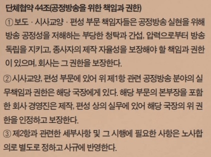 노사가 17일 체결한 새 단협은 향후 비슷한 유형의 갈등을 막기 위해 임명동의제를 포함한 공정방송 제도 일체를 '단협 5장 공정방송'으로 통합했다. 기존 보도준칙과 편성규약 등에 있던 공정방송의 가치와 공정방송 책임자들의 책임‧권한도 단협 44조에 명시했다.