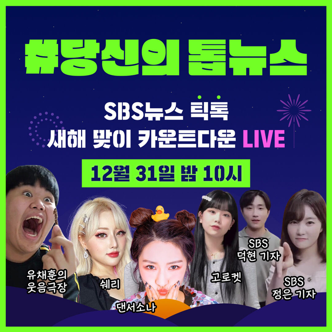 SBS 뉴스가 31일 오후 10시부터 틱톡을 통해 2022년 새해맞이 카운트다운 라이브를 진행한다. 방송은 틱톡 앱·웹에 접속해 SBS 뉴스 틱톡 채널(@sbsnews)에서 시청할 수 있다.