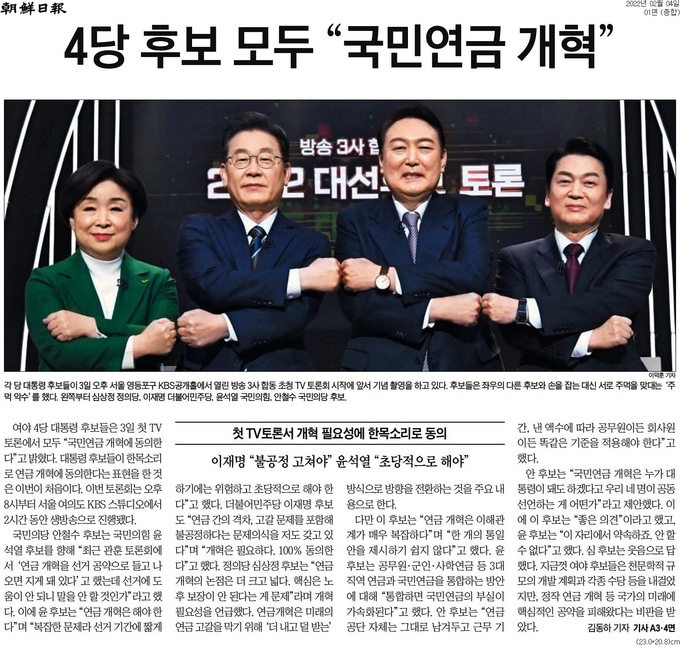 조선 <4당 후보 모두 “국민연금 개혁”>