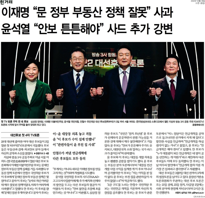 한겨레 <이재명 “문 정부 부동산 정책 잘못” 사과/윤석열 “안보 튼튼해야” 사드 추가 강변>