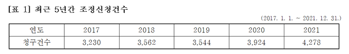 지난해 언론중재위원회(언중위)에 접수된 조정신청건수가 최근 5년 사이 가장 많았던 것으로 집계됐다. 언중위에 따르면 2021년 접수돼 처리된 조정신청건수는 총 4278건으로, 2017년(3230건)과 비교해 1048건이 늘었다. 언중위는 “세월호 사건 관련 대량 신청이 폭주한 2014년과 2015년을 제외하면 역대 최다 건수”라며 “10년 전인 지난 2011년(2124건)과 비교하면 101.4% 증가한 수치”라고 밝혔다.