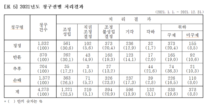 한편 지난해 처리된 조정신청건수 중 조정이 성립된 사건은 전체의 28.5%(1221건)인 것으로 나타났다. 정정보도 합의가 561건으로 가장 많았고 그 뒤를 손해배상 합의(363건), 반론보도 합의(262건), 추후보도 합의(35건) 등이 따랐다. 신청인의 주장이 이유 없어 기각된 사건은 전체의 13.9%(596건)였고, 조정신청이 부적법해 각하 결정이 내려진 사건도 전체의 3.1%(132건)였다.
