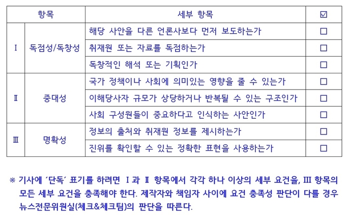 구성 요소에 따라 단독 표기 여부를 결정할 수 있는 8가지 체크리스트를 구성했다. 기사에 단독 표기를 하려면 ‘독점성‧독창성’과 ‘중대성’ 항목에서 각각 하나 이상의 세부 요건을, ‘명확성’ 항목의 ‘정보의 출처와 취재원 정보를 제시하는가’와 ‘진위를 확인할 수 있는 정확한 표현을 사용하는가’를 모두 충족해야 한다.