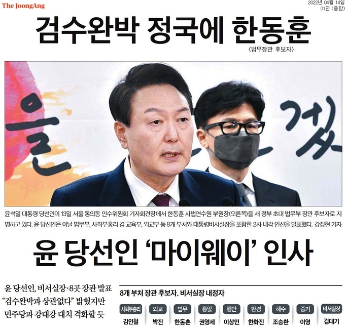 ‘복심’ ‘윤의 남자’ ‘윤의 최측근’. 윤석열 대통령 당선자가 법무부 장관 후보로 한동훈 검사장을 지명하자 신문들이 14일자 1면 제목에 붙인 수식어다.
