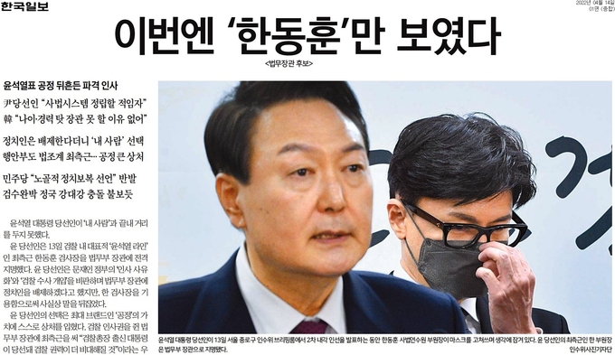 한 후보자 지명에 대해 한국일보는 “윤 당선인이 최대 브랜드인 ‘공정’의 가치에 스스로 상처를 입혔다”고 했다. 한국일보는 14일자 1면 <이번엔 ‘한동훈’만 보였다>에서 “윤 당선인은 문재인 정부의 ‘인사 사유화’와 ‘검찰 수사 개입’을 비판하며 법무부 장관에 정치인을 배제하겠다고 했지만, 한 검사장을 기용함으로써 사실상 말을 뒤집었다. 검찰 인사권을 쥔 법무부 장관에 최측근을 써 ‘검찰총장 출신 대통령이 당선돼 검찰 권력이 더 비대해질 것’이라는 우려에 기름을 부었다”고 우려했다.