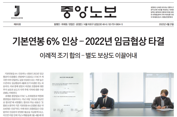 중앙일보‧JTBC 노사가 기본연봉 6% 인상에 합의했다. 중앙일보‧JTBC 노사는 지난 19일 성과평가에서 B를 받은 직원 기준, 기본연봉 6%를 인상하는 내용의 ‘2022년 임금인상 합의문’에 서명했다. 6% 인상은 연 평균 314만원 가량으로, 연봉제 도입 이후 단일연도 실질 인상분으론 가장 높은 수준의 임금 인상이다.