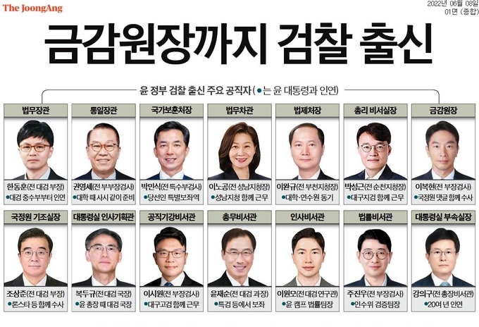 중앙일보는 1면 <금융원장까지 검찰 출신>에서 윤석열 정부에서 주요 요직을 꿰찬 검찰 출신 인사 14명의 프로필을 실었다. 한동훈 법무부 장관, 이공노 법무부 차관, 이완규 법제처장, 박민식 국가보훈처장, 조상준 국정원 기조실장(전 대검 형사부장), 박성근 국무총리 비서실장(전 서울고검 검사), 복두규 대통령실 인사기획관(전 대검 사무국장), 이원모 인사비서관(전 대검연구관), 이시원 공직기강비서관(전 부장검사), 주진우 법률비서관(전 검사), 윤재순 총무비서관(전 대검 운영과장), 강의구 부속실장(전 검찰총장 비서관) 등이다.