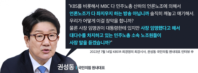권 원내대표는 이날 KBS 라디오 '최경영의 최강시사' 인터뷰에서 "KBS를 비롯해 MBC 다 민주노총 산하의 언론노조에 의해서, 언론노조가 다 좌지우지하는 방송 아닌가"라며 "사장 임명권이 대통령한테 있지만 대다수를 차지하고 있는 민주노총 소속 노조원들이 사장 말을 듣겠느냐"고 말했다.