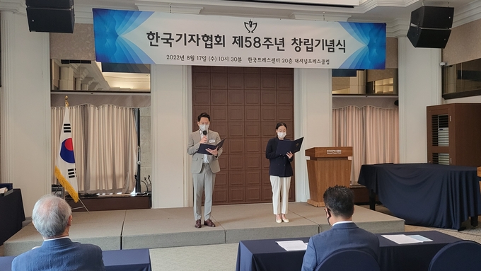 한국기자협회 창립 58주년 기념식이 17일 서울 중구 한국프레스센터 20층 내셔널프레스클럽에서 열렸다. 지난해 창립 57주년 기념식이 코로나19 거리두기 4단계 격상으로 취소됨에 따라 2년 만에 치러진 행사였다.