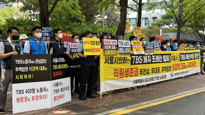 한편 TBS 이사회와 경영진이 총사퇴해야 한다는 주장도 나왔다. 강병호 배재대 미디어콘텐츠학과 교수는 “특정 지향에 매몰된 이사회와 경영진이 조기 사퇴함으로써 TBS가 미래를 위한 첫발을 내디딜 수 있다”며 “과거와의 철저한 단절만이 부활의 해법”이라고 주장했다. TBS 다수 노조인 TBS노동조합도 이날 공청회가 열리는 서울시의회 의원회관 앞에서 기자회견 및 결의대회를 열고 “TBS 조직원들의 목숨이 벼랑 끝으로 몰렸음에도 불구하고 무관심, 무대응, 무책임한 대책으로 버티고 있는 이강택 대표의 사퇴를 강력하게 촉구한다”고 밝혔다.