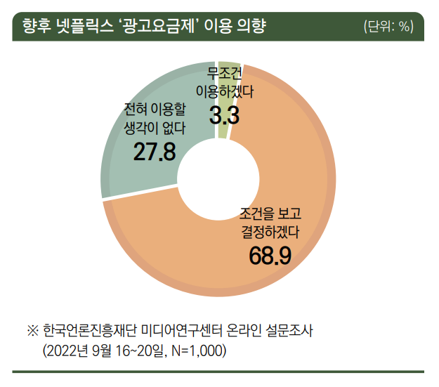 한국언론진흥재단(언론재단)이 지난 26일 발간한 미디어이슈 8권5호 ‘광고요금제 도입을 앞둔 넷플릭스에 대한 인식 및 이용조사‘(양정애 언론재단 책임연구위원, 최진호 언론재단 선임연구위원)에 따르면 넷플릭스가 광고요금제를 출시하면 이용할 의향이 있는지를 물은 결과 응답자 1000명 중 72.2%가 이용의향을 드러냈다. 특히 조건을 보고 결정하겠다는 답이 68.9%였다. 무조건 이용하겠다 3.3%, 전혀 이용할 생각이 없다는 27.8%였다.